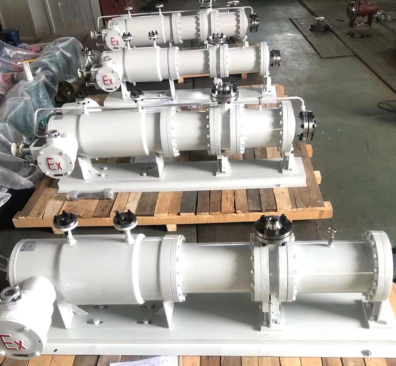 屏蔽泵是用同一根軸將電機的轉子和離心泵的葉輪固定在一起,然后用屏蔽套將這一組轉子屏蔽住。而電機的定子圍繞在屏蔽套的四周,屏蔽套是由金屬制成的,因此動力可以通過磁力場傳遞給轉子。而整個轉子都在被泵送液體中運轉。屏蔽的端部靠法蘭或焊接的結構實現靜密封。屏蔽套實際上是一個壓力容器。定子的內表面和轉子的外表面裝有耐腐蝕金屬薄板制造的定子屏蔽套和轉子屏蔽套。各自端面用耐腐蝕金屬薄板與它們焊接,與被輸送液體分隔,使定子繞組鐵芯和轉子鐵芯不受浸蝕。除了屏蔽套之外,還有一個部件是循環管,利用泵送液體對軸承潤滑與冷卻,有時也對電機冷卻。屏蔽泵的軸向力平衡方式,通常采用自動推力平衡裝置,有時也選用葉輪背面裝有徑向葉片,即背葉輪推力平衡機構。